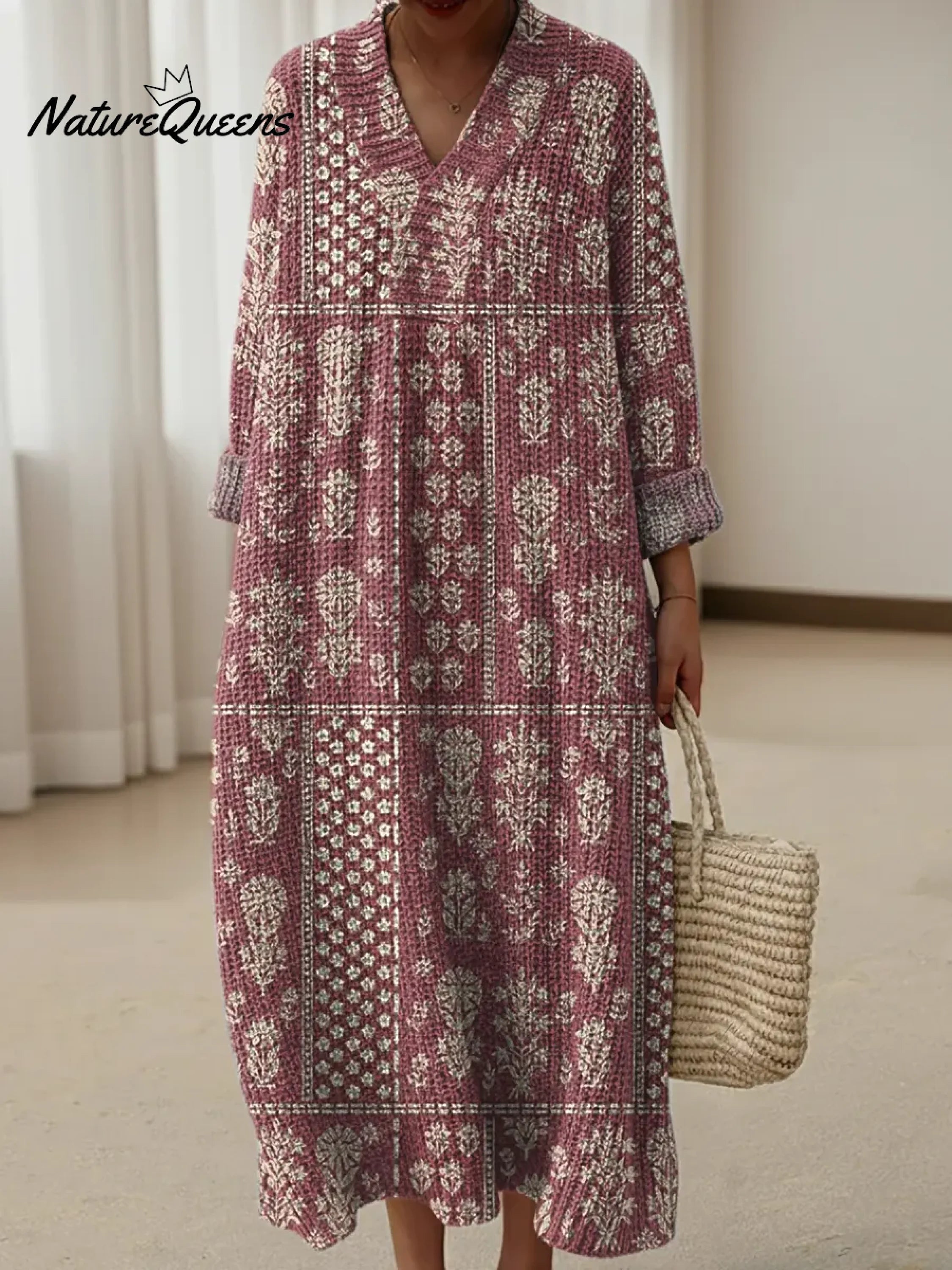 Women's Vintage Flower Pattern Art Print V-neck Knitted Sweater Dress